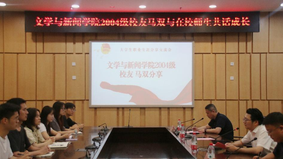 在我校“七秩重工商,逐梦新时代”70周年校庆活动之际,为发挥优秀校友对青年学生的引领作用,帮助我校学生更好制定人生规划,校团委联合文学与新闻学院,邀请文学与新闻学院2004级马双校友开展 “久久为功,善作善成”大学生职业生涯分享交流会。校团委书记吴佑波,文学与新闻学院党委书记于频、党委副书记程元元、专职组织员王欢、分团委书记刘平,校团委栾薇薇老师及学生骨干代表50余人参加,会议由文学与新闻学院党委副书记程元元主持。