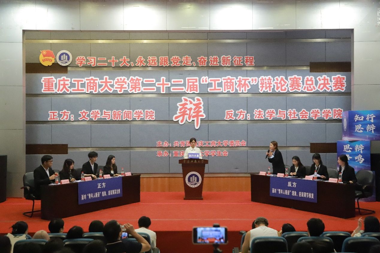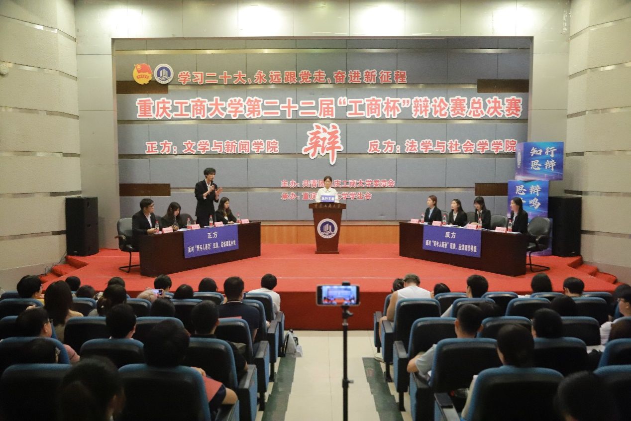 5月24日下午,由校团委主办、校学生会承办的第二十二届“工商杯”大学生辩论赛总决赛暨颁奖典礼在南岸校区博智楼7100报告厅顺利举办。党委常委、副校长李国军,校团委书记吴佑波,法学与社会学学院党委书记李莉莎,文学与新闻学院院长殷俊,校团委副书记胡婧婷与400余名同学一起观看比赛。党委常委、副校长任毅,校党政办公室主任蒋年韬,重庆邮电大学辩论队指导老师齐东文,重庆理工大学辩论队指导老师孔傲翀,校辩论队指导老师柴樱芝担任决赛评委。