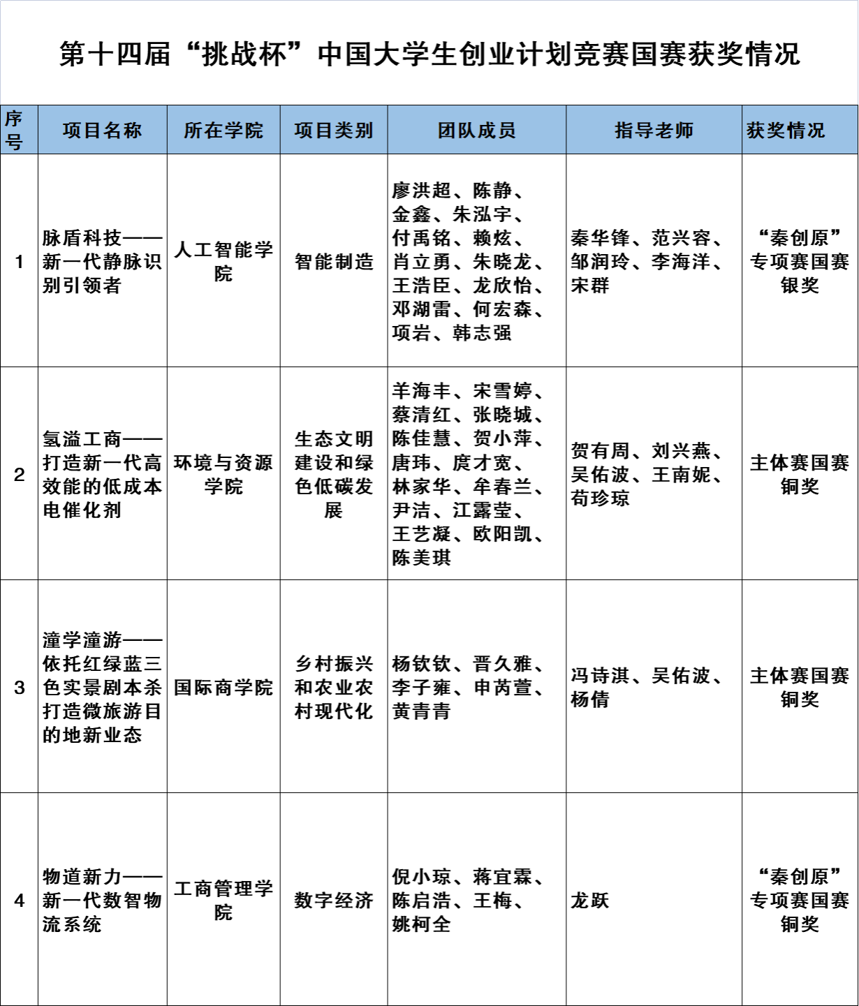 10月29日-11月2日,由共青团中央、教育部、人力资源社会保障部、中国科协、全国学联、陕西省人民政府联合主办,由西安交通大学、共青团陕西省委承办的第十四届“挑战杯”中国大学生创业计划竞赛在西安交通大学(兴庆校区)举行,我校斩获国赛银奖1项,铜奖3项。人工智能学院项目《脉盾科技-新一代静脉识别引领者》赴西安交通大学参加“秦创原”创新挑战专项赛终审答辩,斩获国赛银奖;环境与资源学院项目《氢溢工商一打造新一代高效能的低成本电催化剂》、国际商学院项目《潼学潼游—依托红绿蓝三色实景剧本杀打造微旅游目的地新业态》荣获主体赛国赛铜奖;工商管理项目《物道新力——新一代数智物流系统》荣获“秦创原”创新挑战专项赛国赛铜奖。