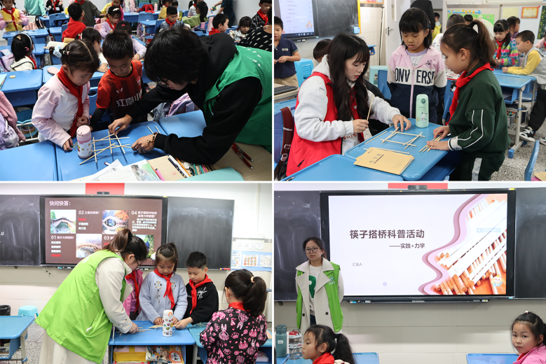 二年级公开课上,科技协会成员深入浅出地为同学们讲解力学原理在筑桥工程中的应用,并借助视频等方式讲解筷子搭桥的操作技巧,鼓励同学们分组配合,合作搭建筷子桥。随后,科技协会成员们还通过问答、互动等形式,让同学们参与其中,将科学的种子埋入心中。