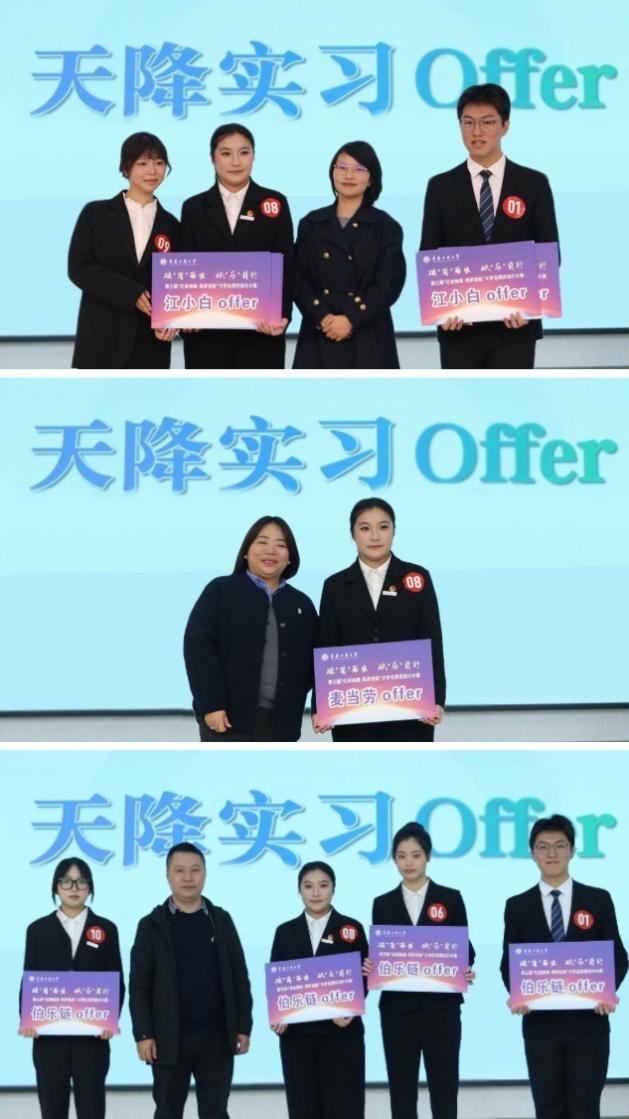 比赛环节结束后,还进行了激动人心的“天降offer”环节,来自江小白、伯乐链、麦当劳的HR们,给现场的部分选手发放了“实习offer”。