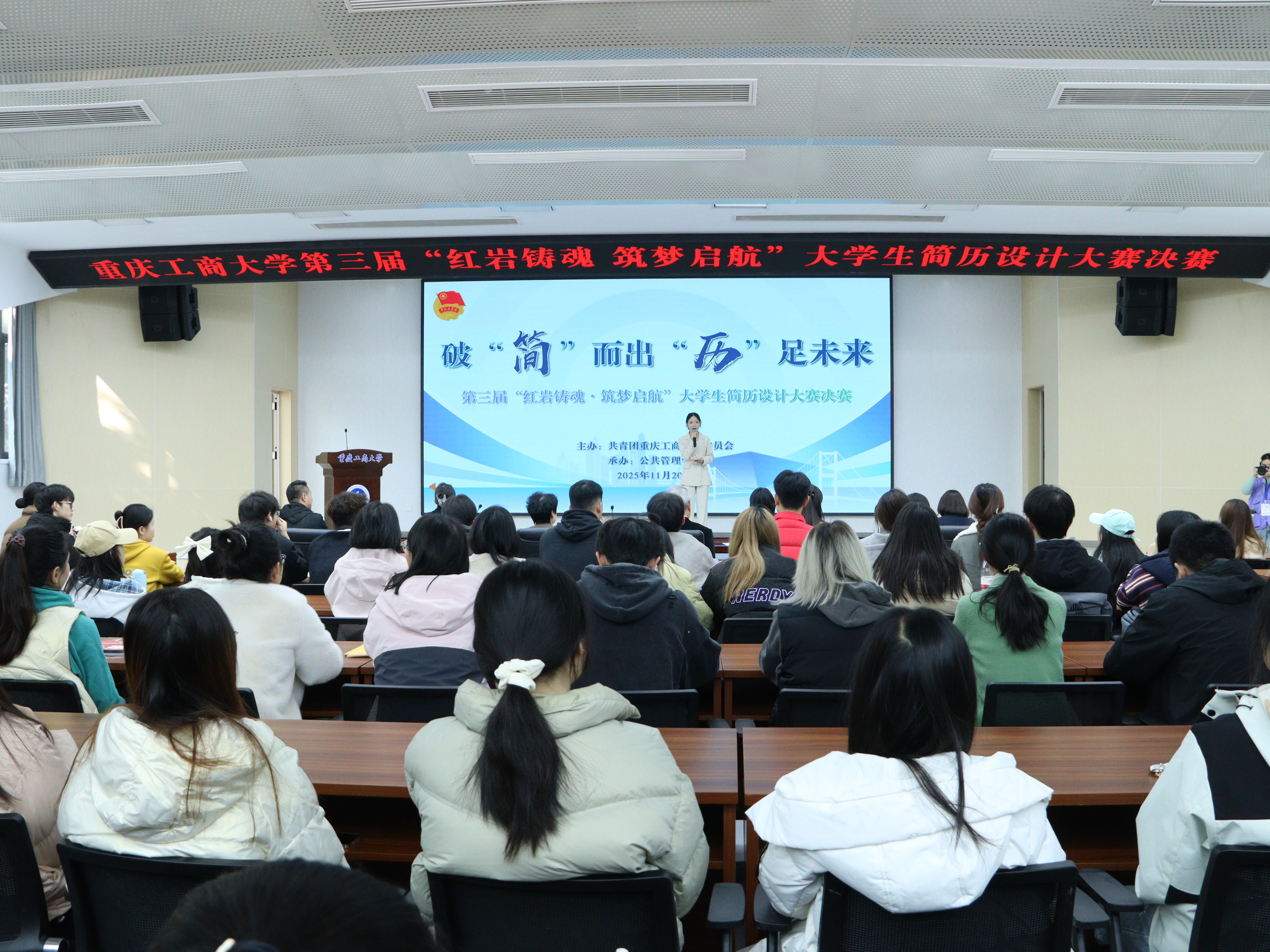 11月20日,由校团委主办、2138CC太阳集团承办的我校第三届“红岩铸魂・筑梦启航”大学生简历设计大赛决赛于南岸校区明德楼1019报告厅举行。党委常委、副校长李国军,党委学工部副部长林璐,招生就业处副处长周婷、校团委副书记王微、2138CC太阳集团党委书记陆嘉、副书记谢书楠与现场200余名同学共同观摩比赛。比赛邀请招商银行重庆分行人力资源部招聘经理周芳、赛力斯集团人资总部招聘调配业务经理吴倩、重庆江小白酒业有限公司人力资源经理叶奕利、重庆伯乐链人力资源有限公司总经理陈和清、麦当劳重庆区人力资源经理吕美玲担任评委。