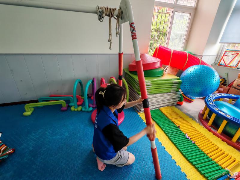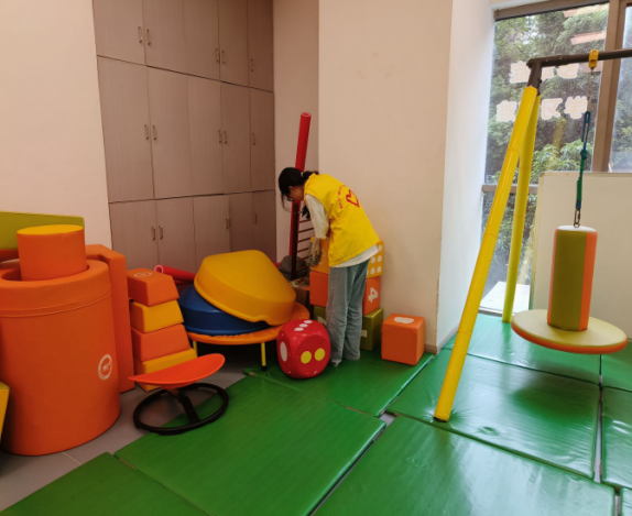 志愿者分工协作,一方面细致整理感统训练区域的彩色体能器材,归类摆放,确保训练设备安全便捷;另一方面全面清扫活动区,擦拭玩具设施、清洁地面,不遗漏任何卫生死角。经过全员协作,儿童中心环境焕然一新,为特殊儿童打造了更舒适健康的学习生活场景,用严谨行动传递对特殊群体的关爱与责任。