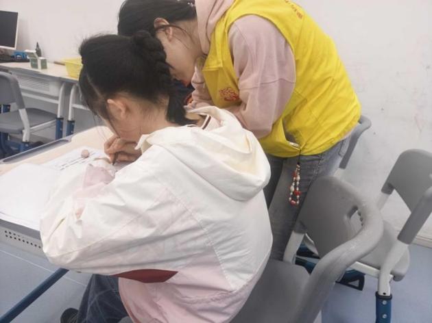 在两个基地同步推进志愿服务:渝中区丹佛儿童中心,“馨小青”身着黄色爱心马甲,俯身辅导孩子学习,细致讲解知识要点、引导解题思路,同时整理感统教具,将橙色圆柱、彩色平衡装置等分类收纳,筑牢训练安全屏障。南岸区启明星儿童中心,志愿者上午整理感统器材、协助课堂筹备,为教学打基础;下午陪伴孩子绘画创作,倾听他们的创意表达,用鼓励激发艺术想象力,每一幅童趣画作都成为心灵共鸣的见证,多维度为特殊儿童注入青春关怀。