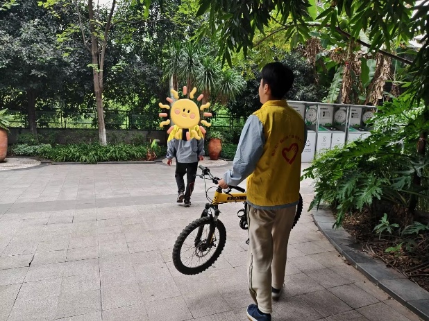 渝州心语基地,志愿者分两批行动——室内用彩色积木搭建闯关路径、训练绳设计趣味挑战,牵手引导孩子完成感统训练,欢声笑语充盈活动室;户外则牵手孩子逛公园,协助他们尝试骑行,用耐心守护每一份童真。在向日葵基地,举办“爱心相伴,温暖同行”活动,通过音乐律动、手工绘画、积木搭建等环节,倾听孩子讲述“高楼”“飞船”的创意,助力特殊儿童融入集体,让温暖与陪伴落地生根。