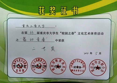 我校王天琦等8名选手在艺术团老师的指导下,为此次比赛精心排演了舞蹈《花样年华》。舞蹈采用国标舞的形式,融入中国元素,以唯美的画面感,凭借新颖而富有创意的舞蹈编排,以及大方得体的服装造型和强烈的现场感染力获总决赛二等奖。
