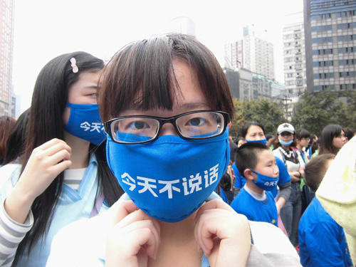 下午14点30分,重庆南坪宏声文化广场,200余名手举彩旗、身着蓝衣、戴着蓝口罩的志愿者聚集于此,准备开始一次特殊的 “蓝色行动·今天不说话” 徒步倡议:从宏声文化广场出发,途径永辉超市、万达广场,再回到宏声文化广场,用“今天不说话”的方式体验自闭症儿童“无声的世界”。