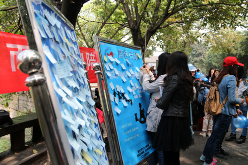 上午10点整,来自我校经济学院、商务策划学院等学院的志愿者们在南岸校区香樟林开展了“自闭症知识普及”、“爱心祝福贴”等志愿服务,引导师生们走进自闭症儿童、了解自闭症儿童、关爱自闭症儿童,活动引起不少师生驻足观看。许多同学纷纷表示,这样一个宣传活动不仅让他们知道了世界自闭症日这样一个日子,还让他们进一步了解到自闭症这种疾病,并参与到关爱自闭症患者的志愿活动当中。