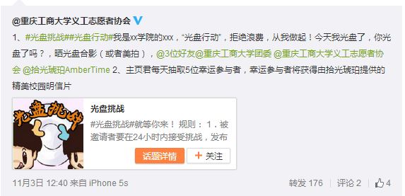 本次活动除深入食堂进行宣传外,进一步创新形式,举行了“微博线上#光盘挑战#活动”。通过新浪微博的方式,参与者在就餐后上传自己光盘的行动的照片并发送一条带有话题#光盘挑战#的微博点名@三个好友,邀请他们接受相同的挑战。此次线上挑战活动得到大家积极响应,共计1000余人参与微博互动, 100 人获得“挑战达人”精美纪念品。