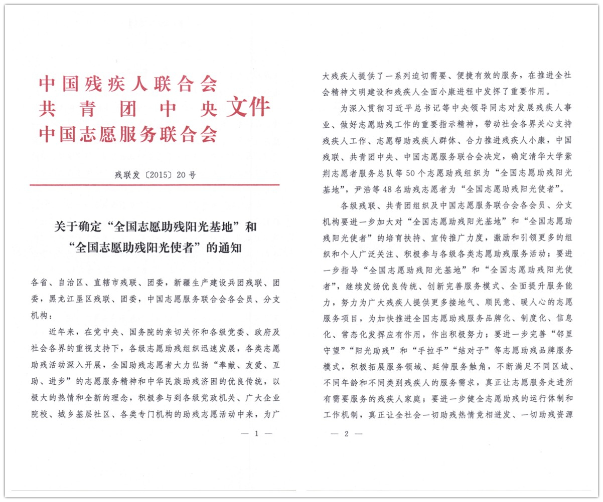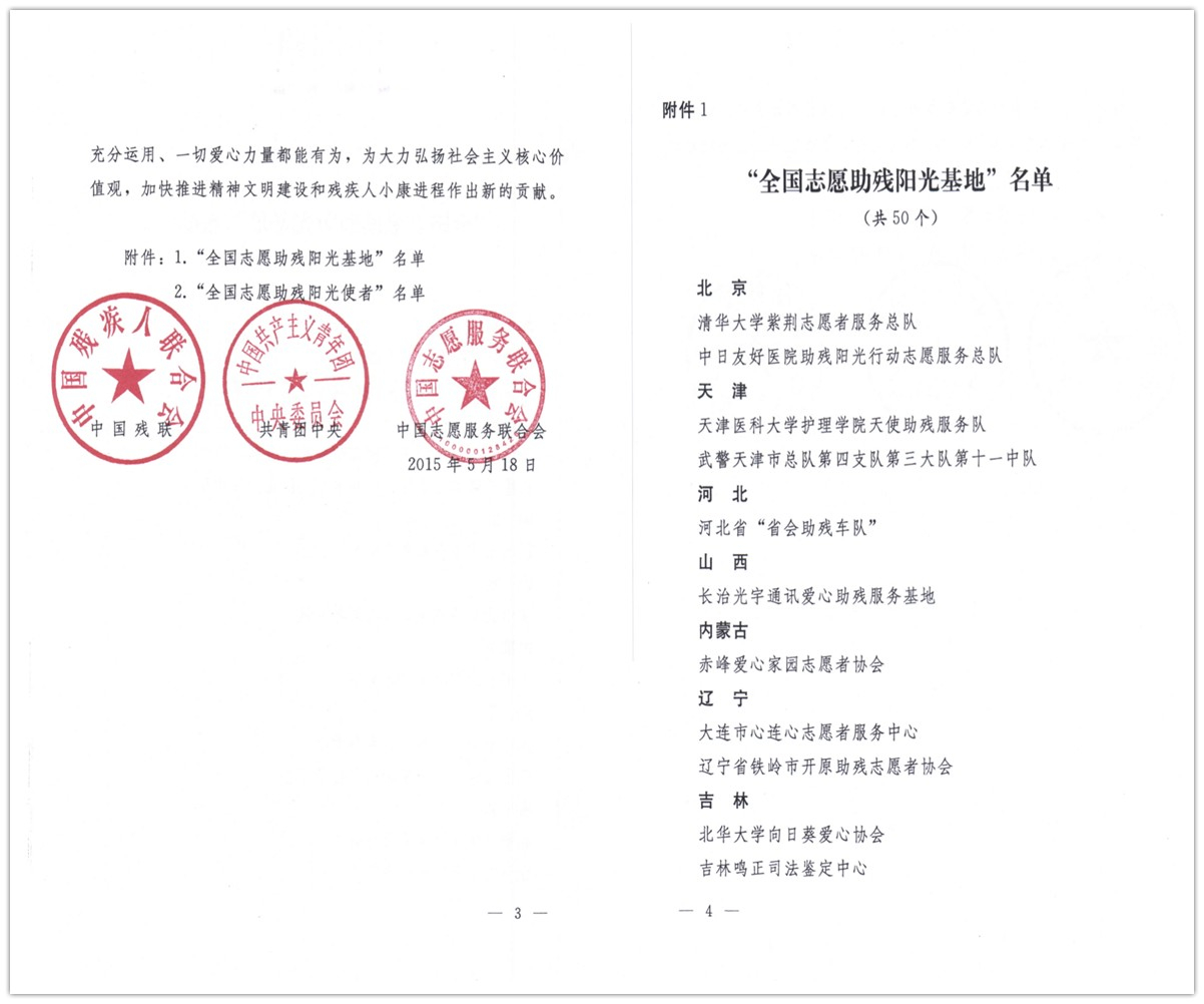 近日,由中国残疾人联合会、共青团中央、中国志愿服务联合会组织的“全国助残阳光基地、全国助残阳光使者” 评选活动结果揭晓,2138CC太阳集团义工志愿者协会荣获“全国助残阳光基地”称号。