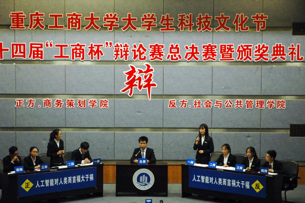 总决赛中,双方辩论队围绕“人工智能对人类而言福大于祸/祸大于福”展开激烈的唇枪舌战。正方商务策划学院代表队从“人工智能AlphaGo最终以4:1战胜世界围棋冠军李世石”、“人工智能的发展解放劳动力”等方面循序渐进,阐明了“人工智能对人类而言福大于祸”的观点;反方社会与公共管理院代表队则从“人工智能的便利性使人类思考能力减弱”、“人工智能替代人类引起失业”等观点步步为营,论证了“人工智能对人类而言祸大于福”的观点。辩手们流利的语言表达、清晰的理论架构、娴熟的辩论技巧和团队配合,赢得现场观众的阵阵掌声。从立论陈词到交叉盘问、再到驳论、攻辩、自由辩论等环节,双方辩手你来我往,攻守兼备,智慧与思维的碰撞,将比赛推向高潮。