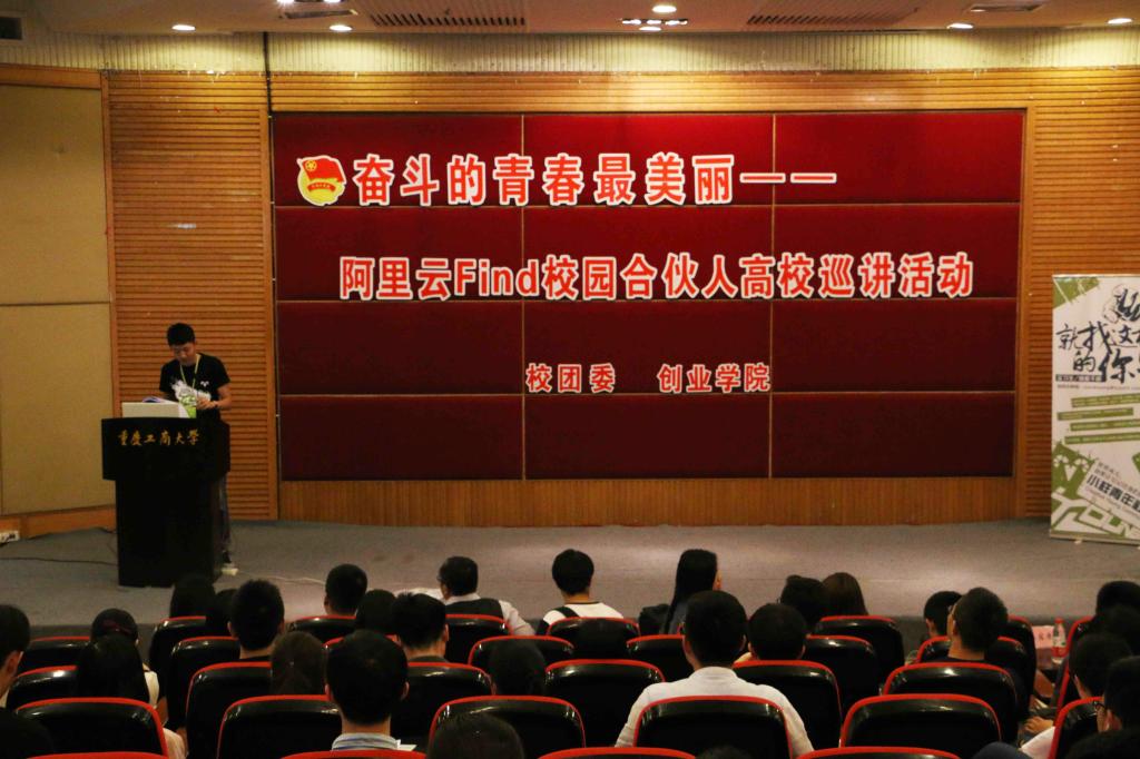 大众创业,万众创新。2016年5月10日下午,由校团委、创业学院主办的“奋斗的青春最美丽——阿里云Find校园合伙人高校巡讲活动”在南岸校区博智楼7200举行。重庆小样创业服务有限公司总经理、中关村创业大街核心运营团队成员林霄、畅捷通运营总监李昌凡等先后进行讲演。整个活动围绕大学生创业进行指导与探讨,充满睿智的思维与开拓的精神。