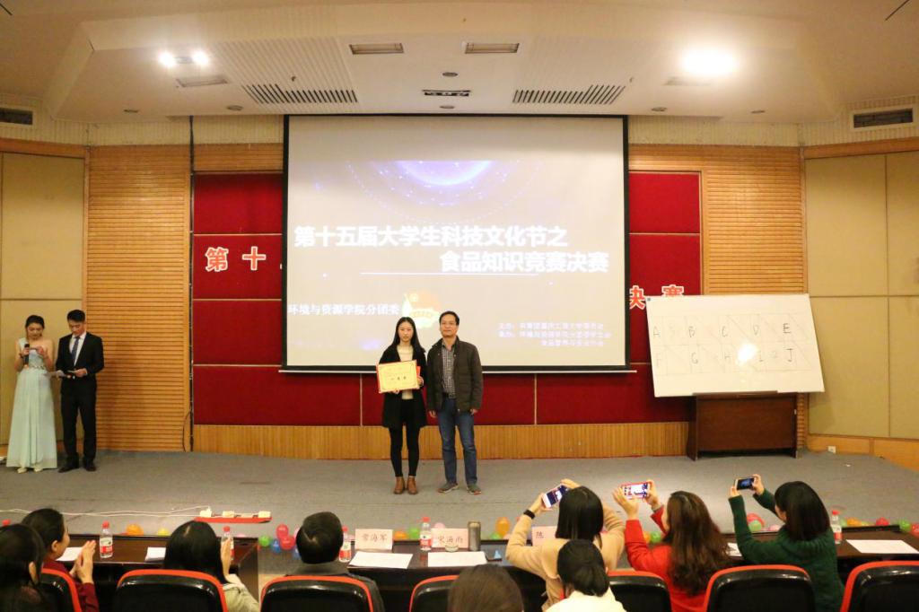 下午2:30,比赛在同学们热烈的掌声中拉开了序幕。环资学院党总支副书记宋海雨首先发表讲话,他指出举办食品知识竞赛是为了倡导大学生了解食品营养与卫生方面的知识、增强食品安全意识。本次比赛为四轮制淘汰赛,比赛题型设有单选题、多选题、问答题、扫雷题和抢答题。整场比赛公开、公正、紧张、有序。每轮比赛间歇还设有现场互动环节,观众答对有关食品知识的问题方即可获得奖品。在这个环节,现场观众热情高涨,争相答题,气氛融洽。最终,来自环资学院的“低调食神”组合获得本次大赛的一等奖,机械学院的“生产队”和通识学院的“阔爱③吃货”获得二等奖,通识学院的“cooperate”和“好好学习”两支队伍以及财金学院的“迷妹儿”组合获得三等奖。