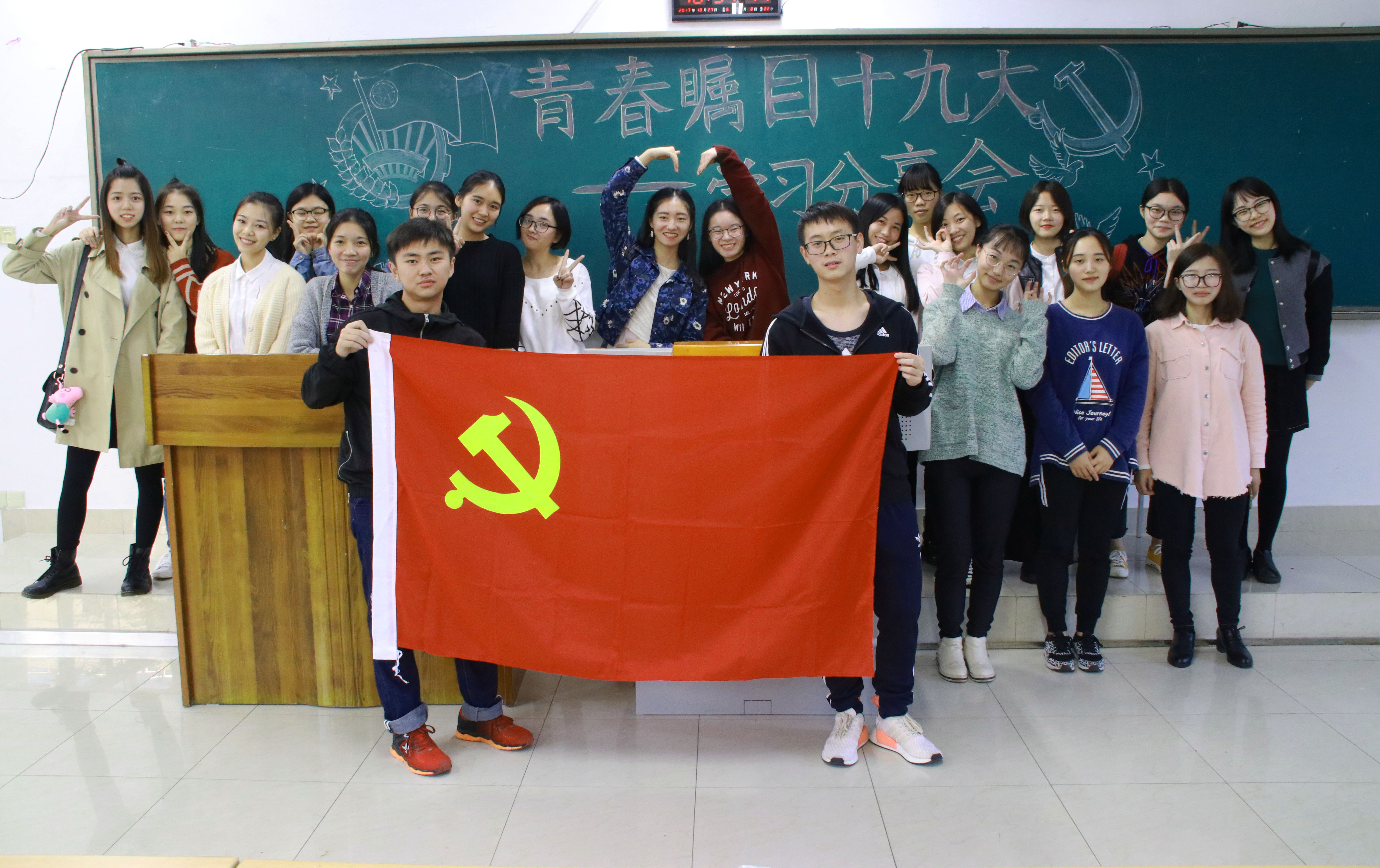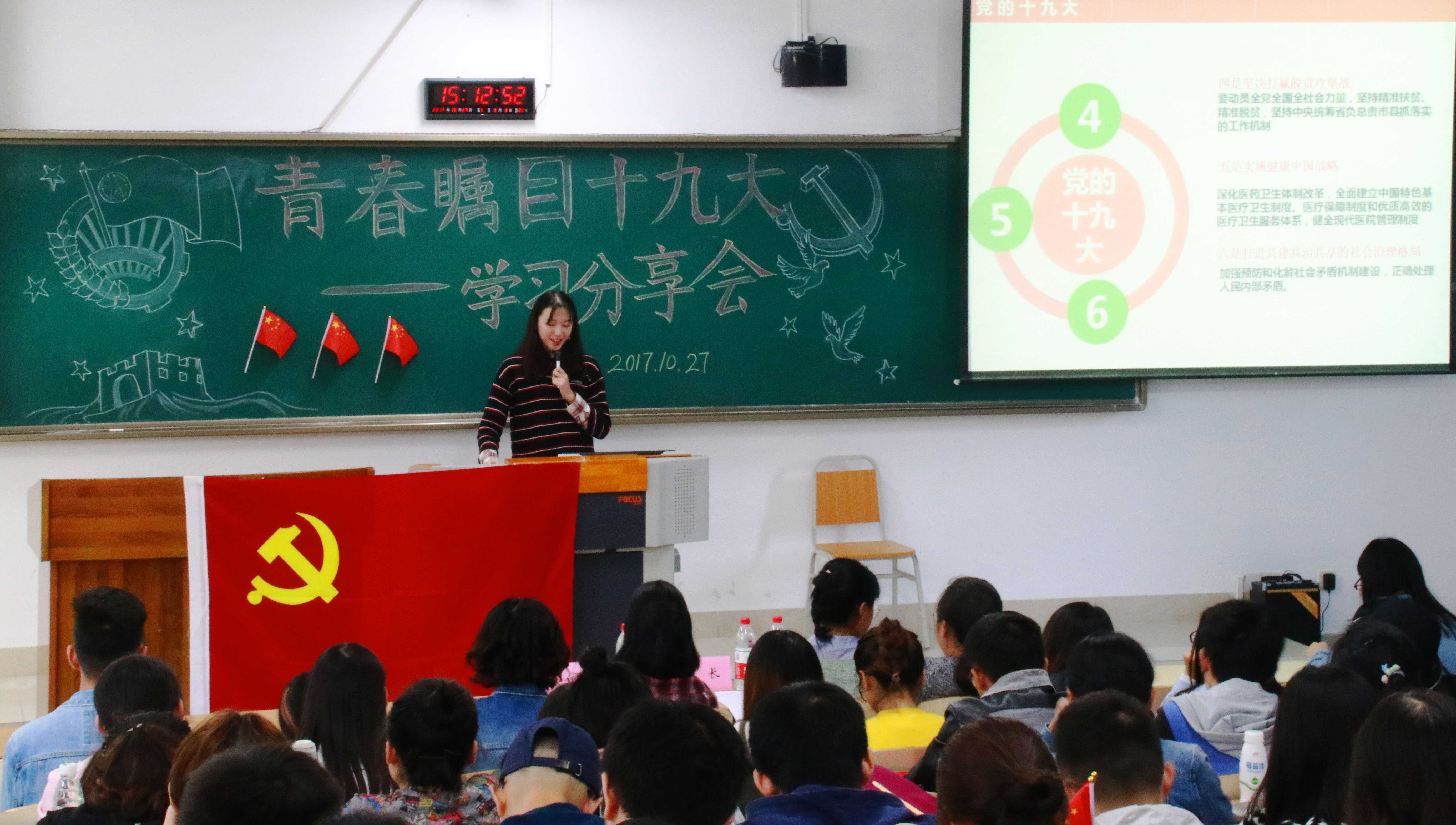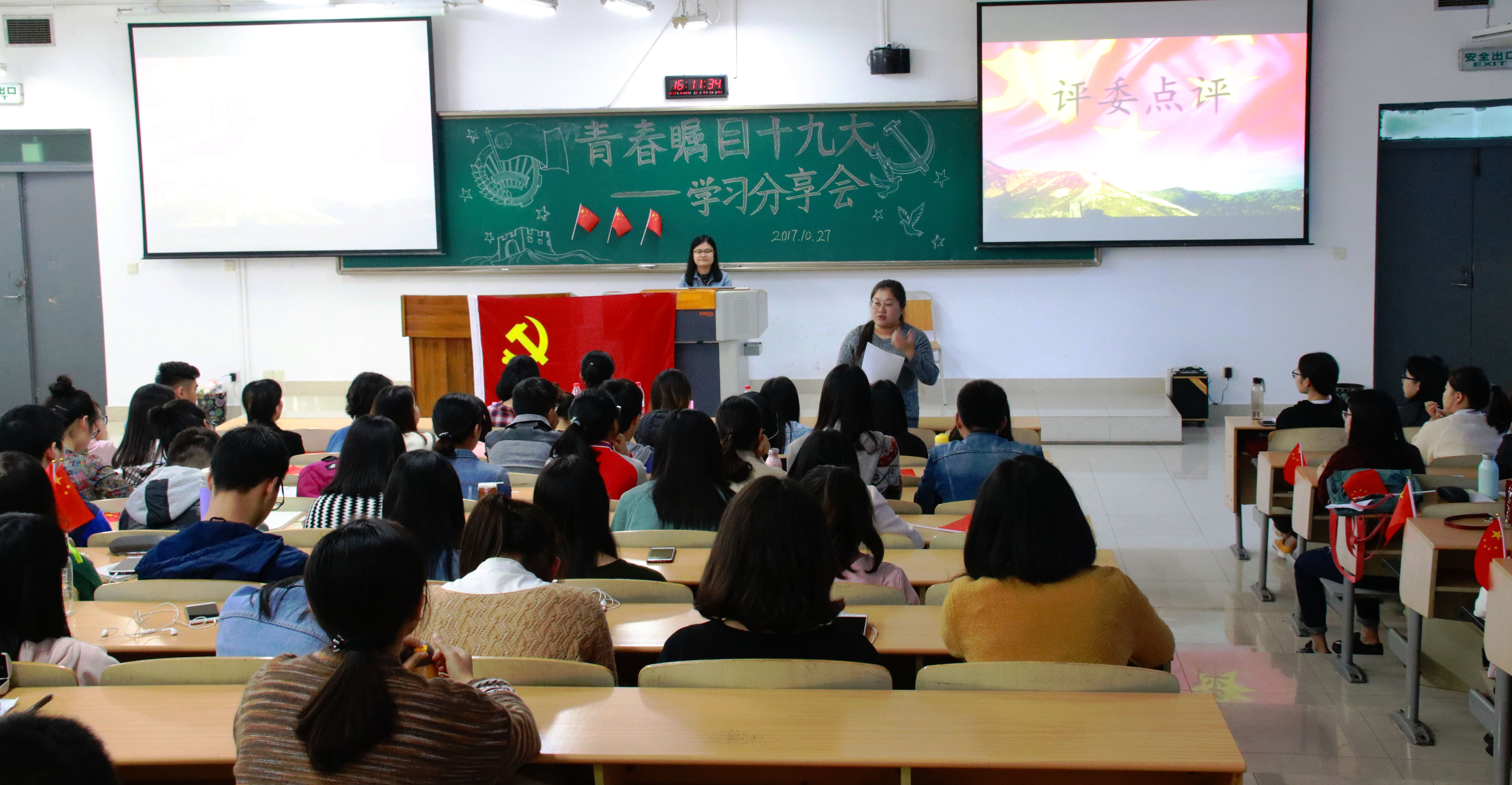 为庆祝中国共产党第十九次全国代表大会的召开,学习习总书记重要讲话精神,提高同学们的政治修养和综合素质,2017年10月27日,财政金融学院党员服务站于博智楼07221教室隆重举办了“青春瞩目十九大”——学习分享会活动。此次活动面向全体2138CC太阳集团财政金融学院在校学生,并有幸邀请到财政金融学院党员服务站指导老师乔明月、财政金融学院党员服务站站长马丽君以及大自委代表出席本次活动。