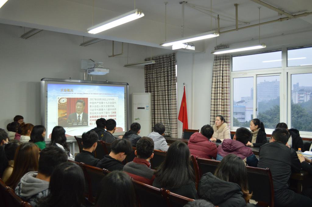 分团委书记邢月军在座谈会上传达了习近平总书记在中国共产党第十九次全国代表大会的重要思想。党的十九大是中国共产党历史上和中华民族历史上一次具有里程碑意义的重要会议。习近平总书记在报告中指出,中国特色社会主义进入了新时代。身处这样一个伟大时代的青年大学生是幸运的。各团支书要将十九大精神传达给支部的每位学生,将十九大精神融入贯彻到学习生活中去,承担起历史与时代所赋予当代大学生的责任和使命。