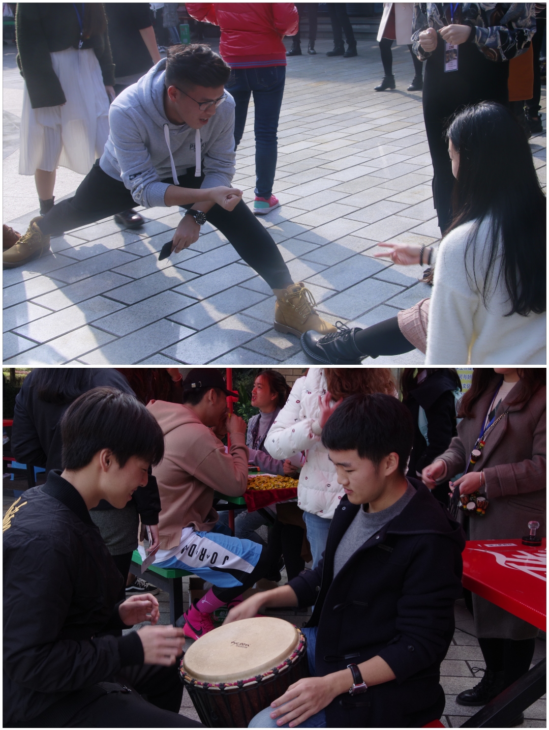 第一个环节中的礼仪知识知多少、你比我猜和七拼八凑三项游戏由礼仪分团负责,身着艺术团制服的礼仪分团成员颦蹙间的风韵深深感染着现场的每一个人。在不远处的合唱分团组织的游戏为猜歌名和敲手鼓,参与者根据乐感,进行判断与模仿,虽然敲手鼓的游戏对有些同学来说有些吃力,但也因为游戏本身的新鲜感一度受到在场同学追捧。舞蹈分团的“下下下”、“知多少”和“猜猜猜”也一度受到热捧,“下下下”即指横跨一步,不断增加两腿间距,无法再继续增加两腿间距者输,这个游戏充分体现了舞蹈分团的同学们的特点,却也让没有韧带基础的同学瞠目咋舌。而播主分团的活动不仅需要绕口令,还需要舔鼻尖和吞拳头,管乐分团“神曲”则需要参赛者听不同的乐器演奏不同音乐的旋律来猜歌名,现场难倒了对流行音乐都仅仅一知半解的同学们。民乐分团设置的三个项目分别为“记忆大师”、“听力大师”和“全能大师”,这三个游戏可谓是全面考验了同学们的能力,精彩纷呈。最后一个游戏由话剧分团准备,分为“我演你猜”、“导演初阶”、“百味人生”三个关卡,每个环节都需要大家调动身上每一个细胞来表演,发挥“戏精”本色。
