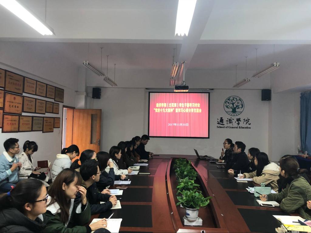 党的十九大是一次不忘初心、团结奋进的历史性盛会,从开幕会时集中收看,到学校、学院各级层面组织宣讲,再到《形势与政策》课上的专题讲解,在学生中间掀起了学习十九大精神的热潮。为持续增进学生学习热情,按照学院党总支统一部署安排,2017年11月30日中午,通识学院(兰花湖)分团委组织30名学生干部在崇德楼313会议室开展了“党的十九大精神”学习讨论暨学习心得分享会,由分团委副书记李亚玲主持,党总支副书记邹奇出席了分享活动。