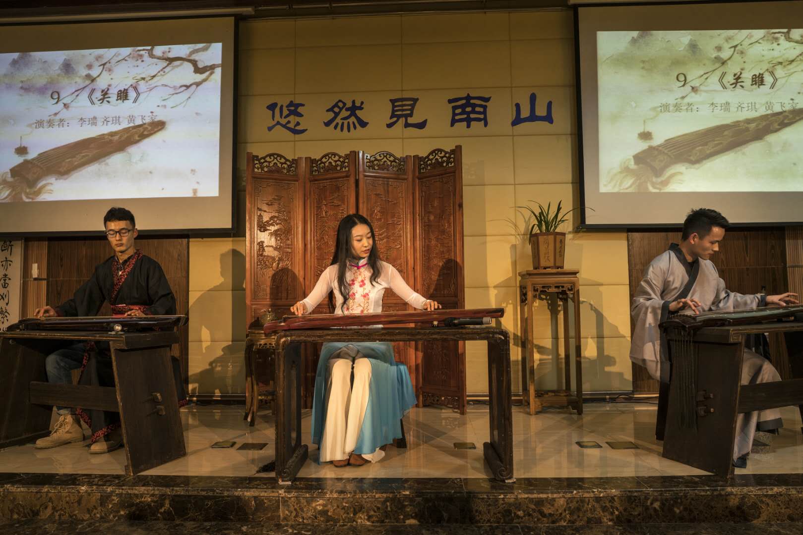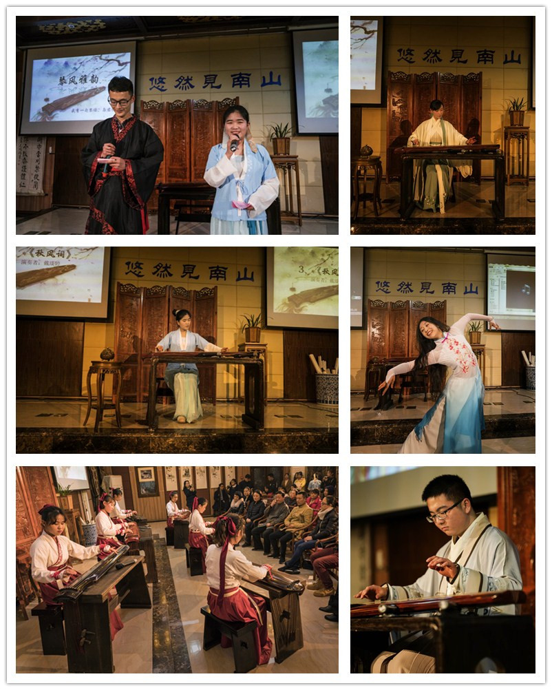 雅集伊始,南山书院院长刘宏毅为活动致辞,他强调古琴文化作为中国传统文化的重要组成部分,值得新时代青年将之传承并大力弘扬,并对学生能学有所成、文人雅士聚集于此表示由衷欣慰。紧接着,汇报演出正式开始。“有美人兮,见之不忘。一日不见兮,思之如狂……”,表演者廖珊轻吟着琴歌《凤求凰》,令司马相如与卓文君的爱情故事浮现在观众眼前,在场各位不禁随之摇首、沉醉。“秋风清,秋月明,落叶聚还散”,表演者戴琰婷似黛玉一般感叹秋日的落叶,让人心醉不已。而一曲《南无阿弥陀佛》琴声曼妙,也让观众们感受到主人公看破一切的不凡气质。本期汇报演出亦不乏黄莺般婉转的歌喉和蝴蝶般蹁跹的舞姿,使人流连忘返。“沧海一声笑,滔滔两岸潮”,最后,活动在六位侠女演奏的《笑傲江湖》的欢快气氛中落下帷幕。