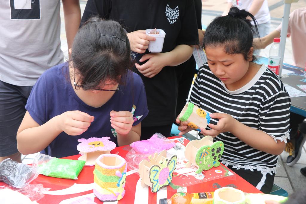 本次活动从上午十点开始,持续至下午两点半。活动共分为“手工DIY”、“爱的丘比特”和“心怀国家事”三个部分。参加活动的同学们在手工DIY中获得了自制折扇、笔筒的乐趣,锻炼了自己的动手能力和想象力;在爱的丘比特中,通过明信片和书信向自己牵挂的人表达自己的爱意;通过套圈回答对应两会相关知识从而获得盆栽奖励,鼓励同学们课余时间心怀国家大事。除此之外,活动参与者可抽取一次捐赠卡,协会将以捐赠卡面额出资捐赠给重庆市残疾人康复中心,同时活动场地设有捐款箱,同学们也可以进行自愿捐赠。热闹温馨的现场氛围赶走了天气的闷热,等来了轻柔的清风和富有爱心的同学们。