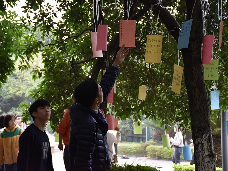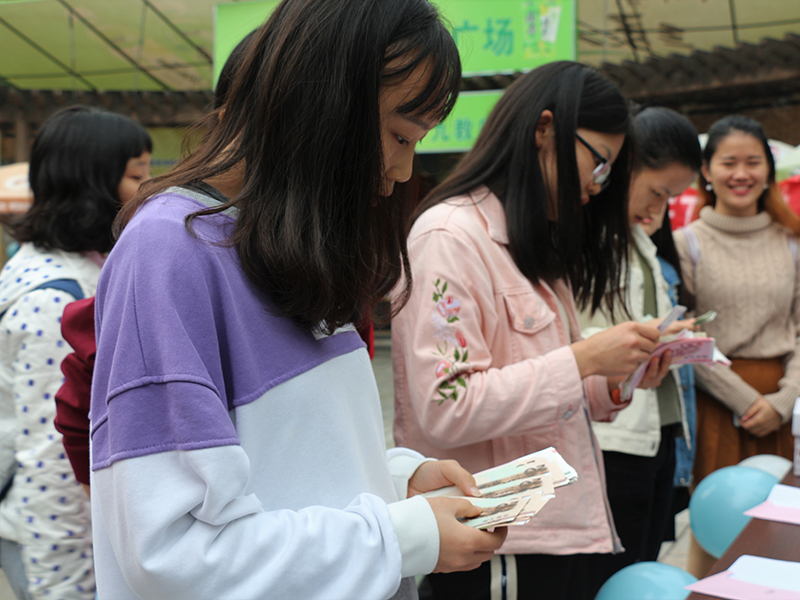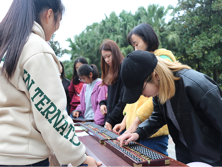 丰富多彩的游戏正在等待同学们的参与,“点钞大作战”考验着同学们数钞的速度与准确性;“打算盘”游戏考验着同学们对传统算具的了解;“找配对”游戏的题目被悬挂在了周末文化广场的树上,颇有中秋解猜灯谜的味道。同学们踮起脚观察着高处的问题或答案,随即又兴冲冲地跑到另外一头和伙伴兴奋地讨论;“接住,该你了”考验着同学们的身体协调能力,就算是一向不苟言笑的同学在参加活动时也难掩憨态可掬,引得周围的同学们捧腹大笑,活动现场满载了欢声笑语。