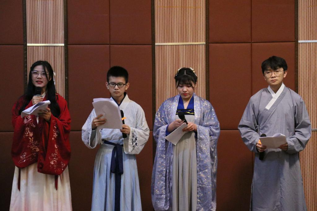 活动在《立冬即事二首其一》中“细雨生寒未有霜,庭前木叶半青黄,小春此去无多日,何处梅花一绽香”营造的意境中拉开了序幕。正如诗词所示,本次活动以立冬为主题,通过同学们精心准备的节目表演,来帮助大家更好地了解立冬习俗,找寻民族记忆,感悟中华文化。活动伊始,立冬的习俗分享立刻活跃了现场气氛,随即《我为汉服浅吟低唱》的朗诵也使同学们重唤民族情怀,体会到传统艺术的魅力;《东风志》、《牵丝戏》的曲目演唱使同学们纷纷感受到了古风的优雅柔情;独舞《天行九歌》将本次活动的气氛推向高潮,大家既被舞者优美的舞姿深深吸引,也对汉服的典雅和精致感到赞叹和钦佩。本次活动在南山传统文化研习社社员的带领下,通过大家一起研究、学习文化,传承着民族记忆,同学们加深对立冬习俗了解的同时也对汉文化有了更深的认识。