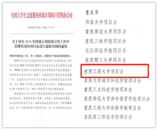 11月20日,团中央学校部、全国学联秘书处下发了《关于2018年全国大中专学生志愿者暑期“三下乡”社会实践活动通报》,校团委获评全国优秀单位(全国共评选300个)。11月16日,全国大学生志愿服务西部计划项目管理办公室下发了《关于对在2018年西部计划招募宣传工作中表现突出的项目办进行通报表扬的通知》,对包括我校在内的185个高校项目办提出通报表扬。