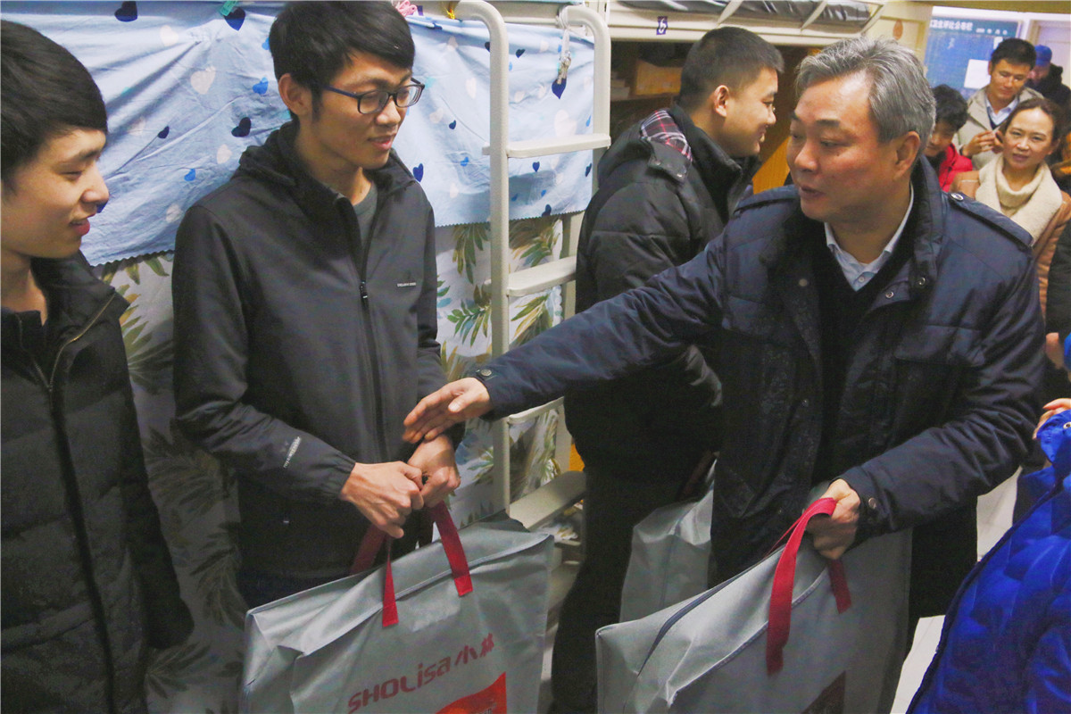在慰问中,校领导与学生进行了亲切交谈,详细询问了宿舍的生活条件和安全情况、在校期间的学习生活状况和寒假的计划等。李春茹书记表示,同学之间能凭借努力走到现在是一种缘分,大家在互帮互助的过程中也培养、锻炼了很多优秀品质,要树立积极乐观、奋发向上的人生态度,克服暂时困难,努力学习,将来成为社会的栋梁之材,回报那些给予过自己帮助的人,并将共青团“暖冬行动”爱心棉被发放到学生手中。