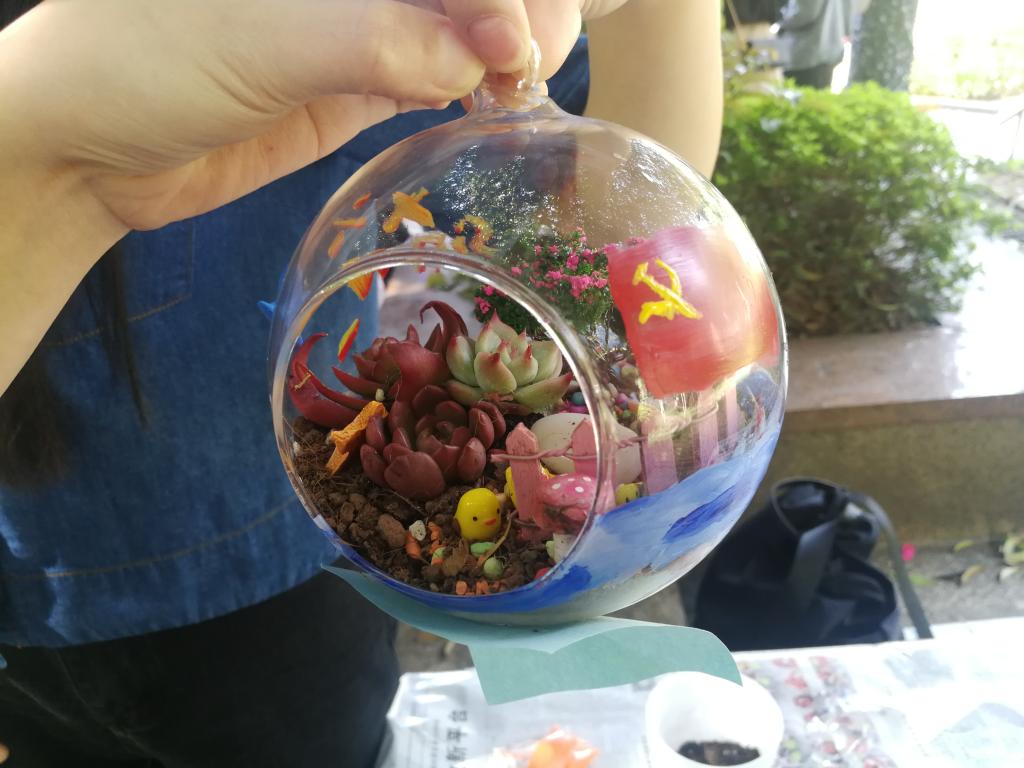 活动开始,主持人介绍了本次比赛举办的背景、比赛规则、要求以及评分细则。二十支参赛队伍带着废弃的纸盒、碗、杯子、瓶子等材料,有序签到入场,领取手工制作素材。比赛共两个环节,分两轮进行。第一环节为团队DIY创作多肉盆景环节,比赛现场,各个小队在规定的时间内进行制作,他们分工明确,或是在盆景上涂鸦、或是进行多肉栽种,或是布置盆景,不一会儿一个个精致的、寓意深刻的多肉盆景制作完成。第二环节为展示环节。参赛队伍依次向大家阐述作品制作理念,选手们的作品大多体现出了自然之美,生态之美,人与自然和谐之美,评委们认真了解,现场打分,在场观众也在线上投票选出自己最喜爱的作品。