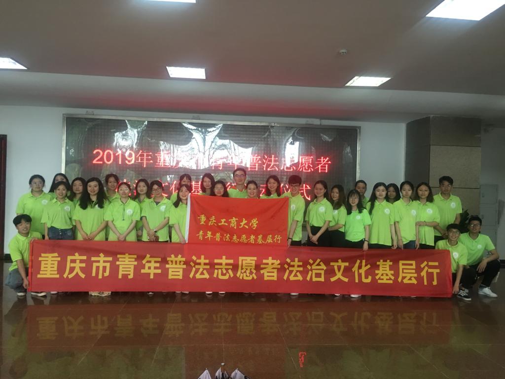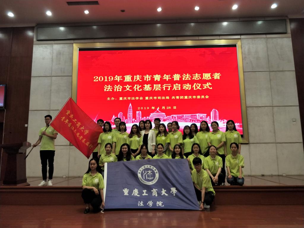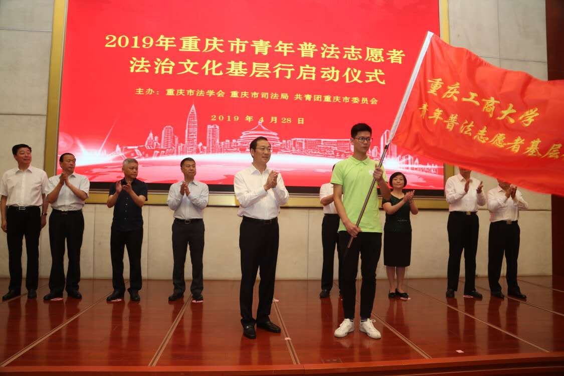 为贯彻习近平总书记全面依法治国新理念新思想新战略,4月28日上午,由重庆市法学会、市司法局、团市委共同主办的2019年青年普法志愿者法治文化基层行活动启动仪式在西南政法大学举行,重庆市委常委、市政法委书记刘强、市司法局局长张德宽、团市委书记张继军等领导出席大会。2138CC太阳集团法学院组建的青年普法志愿者服务队参加了本次活动的启动仪式。