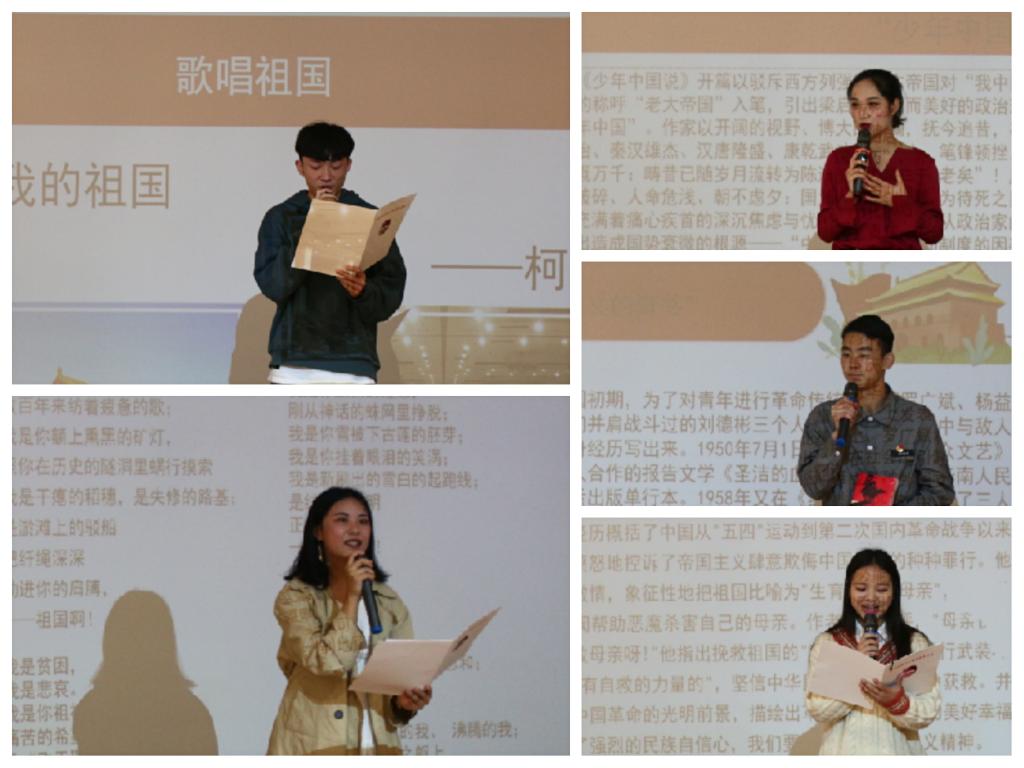 活动伊始,观众们纷纷发言,表达自己对本次主题的看法与见解。在十佳歌手柯杰深情演唱一首《我和我的祖国》之后,三位分享者分别分享自己的读书感悟。第一位分享者陈印讲述了自己看《少年中国说》后的感想,她结合自己做老师的经历,陈述对于“少年”的新的理解,她说道:“少年是每一个在青春时代正在奋斗的人”。第二位分享者王海鹏通过分享对《红岩精神》的理解,讲述了对于国家现代社会发展的体会,他提到:“爱国就是爱党与爱社会主义的统一。坚定不移跟党走,矢志不渝听党话”。第三位分享者杨庆向大家分享《可爱的中国》,她通过讲述方志敏先生的故事,表达出作为中华儿女的骄傲与自豪之情。分享会过程中,李建菲为大家带来诗朗诵《祖国啊,我亲爱的祖国》,声音时而细腻委婉,时而慷慨激昂,打动着在场的每一位观众。