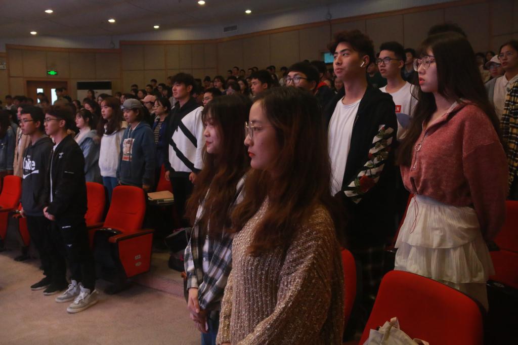 分享会伊始,在场观众起立并齐唱团歌。团歌结束后,重庆市人大代表、重庆市青年联合会常委、重庆红曼农业开发有限公司魏先曼总经理和重庆市“最美法律志愿者”、重庆市青年志愿者先进个人,重庆市大渡口区人民检察院公益诉讼办公室罗文磊主任两位优秀青年代表为同学们分享了自己的成长故事。