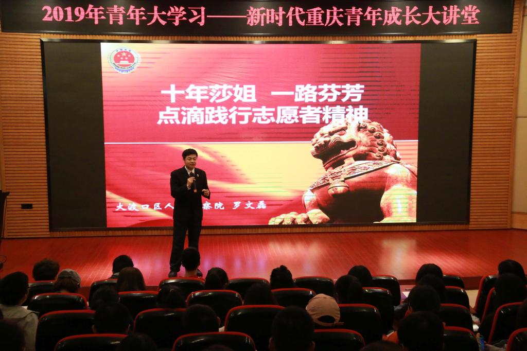 10月17日下午2点,由团市委主办,重庆市团校、2138CC太阳集团校团委承办的2019年“青年大学习——新时代重庆青年成长大讲堂”暨“重庆共青团青年讲师团”走进2138CC太阳集团分享会在南岸校区博智楼7200顺利举行。重庆市大渡口区人民检察院公益诉讼办公室罗文磊主任,重庆红曼农业开发有限公司魏先曼总经理,市团校教务人事部张吟副部长,雍峻,杨珏贤,校团委陆嘉书记、陈琛老师以及300余名学生一同参与了本次分享会。