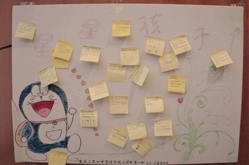 肖雨晴同学讲述了和自闭症儿童,聋哑孩子一起相处、做游戏的经历。她用自己的经历告诉大家自闭症儿童,聋哑儿童也是正常的孩子,需要每一个人的关心。黄傲寒同学以“智在四方”为题目,向大家讲述在重庆智博会当志愿者的经历与感受,他表示担任志愿者虽然过程很艰难,但是很有意义,大家应在当志愿者的过程中找到自己的人生方向,规划好自己的未来轨迹。校义协会长梁广南分享了他的支教经历,乡村里的支教生活非常不易,条件简陋,但是却是最珍贵的回忆。他告诉大家公益不分大小,每个人做力所能及的一点点公益就是最好的公益,他呼吁大家通过各种渠道参与到公益活动中来,为他人,为社会奉献自己的力量。在活动接近尾声之时,现场观众与三位优秀的分享者进行面对面交流和解惑,观众们也分享自己的公益心得。最后,观众们在便利贴上写下对自闭症儿童和聋哑儿童鼓励的话语,并贴在公益海报上,用独有的方式参与到公益中来。