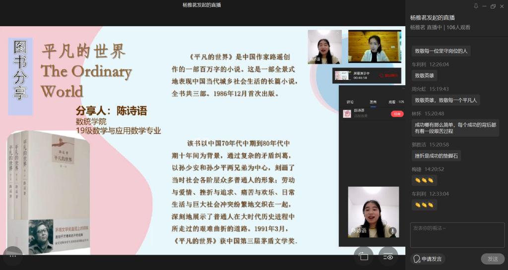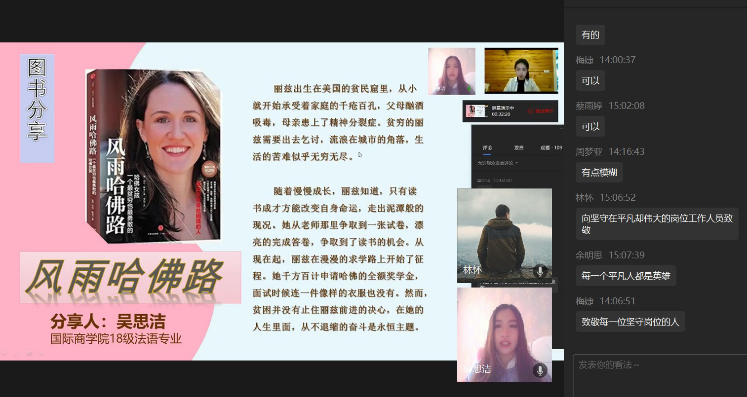 活动以一段《实励派》短视频拉开帷幕,视频讲述了电台主持人、急症医生、出租车司机等每一位平凡又伟大的劳动者,他们用辛勤劳动默默在黑夜中奉献自己,创造中国奇迹。同学们深受感动,纷纷在评论区留言,致敬每一位坚守岗位,不辱平凡的“实励派”。紧接着,来自国际商学院的吴思洁同学分享图书《风雨哈佛路》。她以书籍主人公丽玆从泥潭中走出并改变命运的故事分享了在追梦路上微笑面对挫折,坚强面对苦难的感悟。随后,来自数学与统计学院的陈诗语同学带来书籍《平凡的世界》,她通过讲述主人公自强不息,依靠自己的顽强毅力与命运抗争的故事告诉大家读书与劳动的重要性,并指出学习是通往理想的桥梁,青春在劳动中五彩斑斓。最后,来自现代国际设计艺术学院的沈思言同学分享了《青春行》。他表示,青春是探索、研究与实践,青春就应在社会实践中增强才干,绽放自己,展现风华正茂。每一位分享人都带来自己在阅读中最深切的感悟,引发同学们的思考与共鸣。最后,同学们分享自己在社会实践中的经历,这些经历中有感动,有曲折,有喜悦,这都是青春成长旅途中的别样风采。