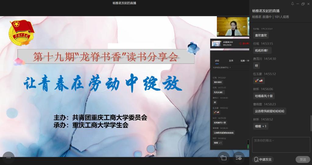 4月10日15:00,由校团委主办,校学生会承办的第十九期“龙脊书香”读书分享会在企业微信成功举办。本期分享会以“让青春在劳动中绽放”为主题,100余名师生观看直播,畅谈收获和感悟,共同分享抗“疫”期间的学习生活心得。