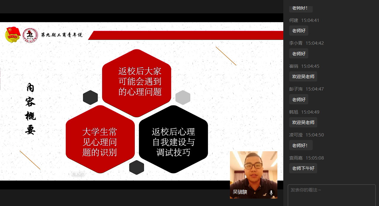 为调整学生疫情期间返校心态,引导学生构建正确的心理观念,5月8日15:00,由校团委主办、校学生会承办的第九期“工商青年说”在企业微信平台顺利举行。本期活动以“返校在即,你的‘心’准备好了吗”为主题,我校青年教师、心理健康与咨询中心咨询师、国家二级心理咨询师吴骕騻主讲,就如何调节心理状态,积极开启疫情防控下的校园生活等问题与200余名同学进行线上分享。