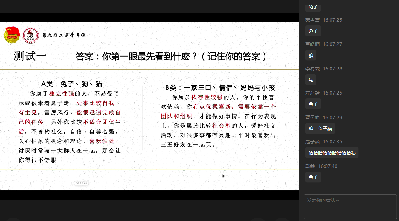 活动伊始,同学们共同观看一段“解压小视频”,视频中由各种积木组成的食物被切割所碰撞出的声音让同学们纷纷表示得到解压与放松。随后,吴老师从返校后会遇到的心理问题、大学生常见心理问题的识别、返校后心理自我建设与调试技巧三个方面展开话题,分析并提出应对措施。吴老师指出,面对返校焦虑,应该摸清焦虑的主要根源,对症下药,多关注行动本身,少臆想结果如何。他讲述了如何通过言行表现对大学生常见的心理问题进行识别,并强调及时发现、及时诊断。此外,吴老师针对心理调节提出建议:生活上规律作息、健康饮食、勤加锻炼;心理上接纳自己,包容他人;学习上制定计划,逐步落实。经过对理论知识的讲解,吴老师带领同学们体验间接性腹式呼吸,放松身心的小技巧,吴老师幽默风趣的言谈使同学们兴趣高涨,在轻松活跃的氛围中,大家踊跃发言提出自己的焦虑与困惑,吴老师一一耐心解答。最后,活动以有趣的心理小测试收尾。