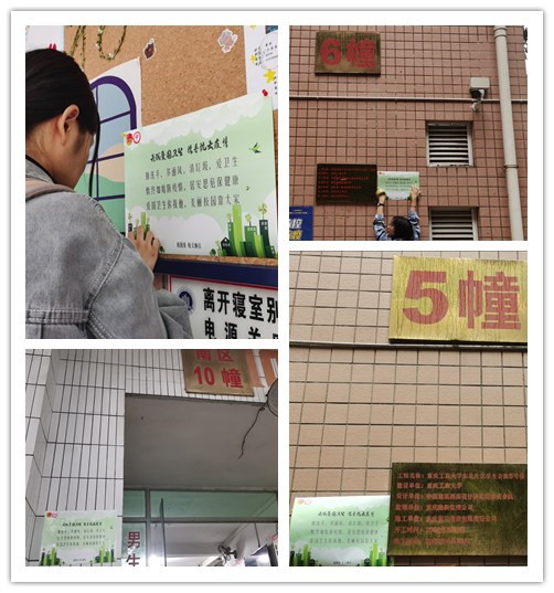为更好的扩大宣传面,校义协印制了“共践爱国卫生,携手抗击疫情”为主题的宣传海报400余张。10月20日起,志愿者们将海报到各学生宿舍进行张贴宣传,指引同学们学习爱国卫生知识,弘扬爱国卫生精神,携手抗击疫情。来自南岸校区北区五幢的肖同学说:“每天进出楼栋都可以看到,这种简单便捷的宣传和提醒,我觉得很有必要。它可以时刻提醒我们,良好健康的习惯非常重要,疫情仍未结束,防控依然要坚持。