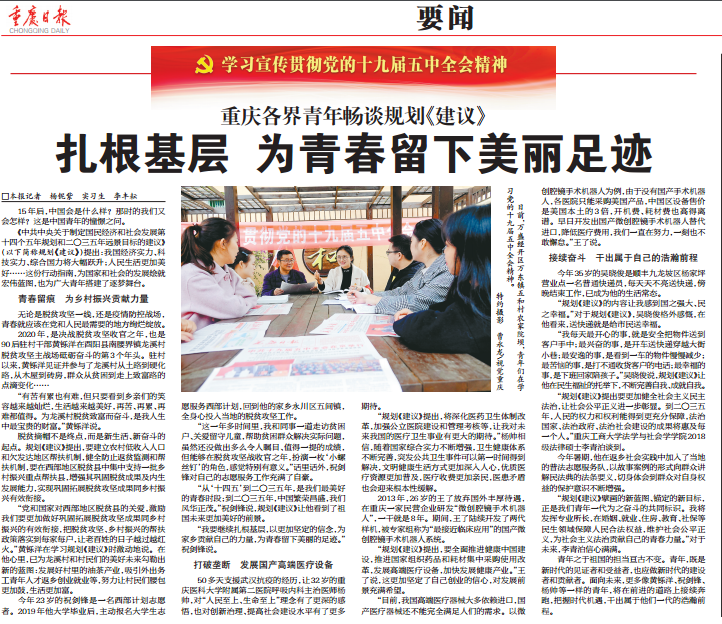其中,法学与社会学学院2018级法律硕士李青泊同学的体会被重庆日报报道。规划《建议》提出要更加健全社会主义民主法治,让社会公平正义进一步彰显。到二〇三五年,人民的权力和权利能得到更充分保障,法治国家、法治政府、法治社会建设的成果将惠及每一个人。李青泊结合三下乡和社会实践经历谈到,今年暑期,他在返家乡社会实践中加入了当地的普法志愿服务队,以故事案例的形式向群众讲解民法典的法条要义,切身体会到群众对自身权益的保护意识不断增强。规划《建议》擘画的新蓝图、锚定的新目标,正是我们青年一代为之奋斗的共同标识。自己将发挥专业所长,在婚姻、就业、住房、教育、社保等民生领域保障人民合法权益,维护社会公平正义,为社会主义法治贡献自己的青春力量。”对于未来,李青泊信心满满。