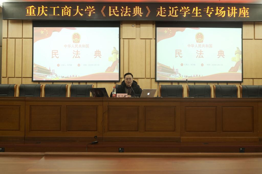 12月11日, “《民法典》走近学生”专场讲座在南岸校区图书馆第一会议室举办,本次讲座特别邀请到我校党政办副主任、民商法博士研究生、副教授刘乃睿担任主讲人,校团委老师王微和百余名同学参加本次讲座。