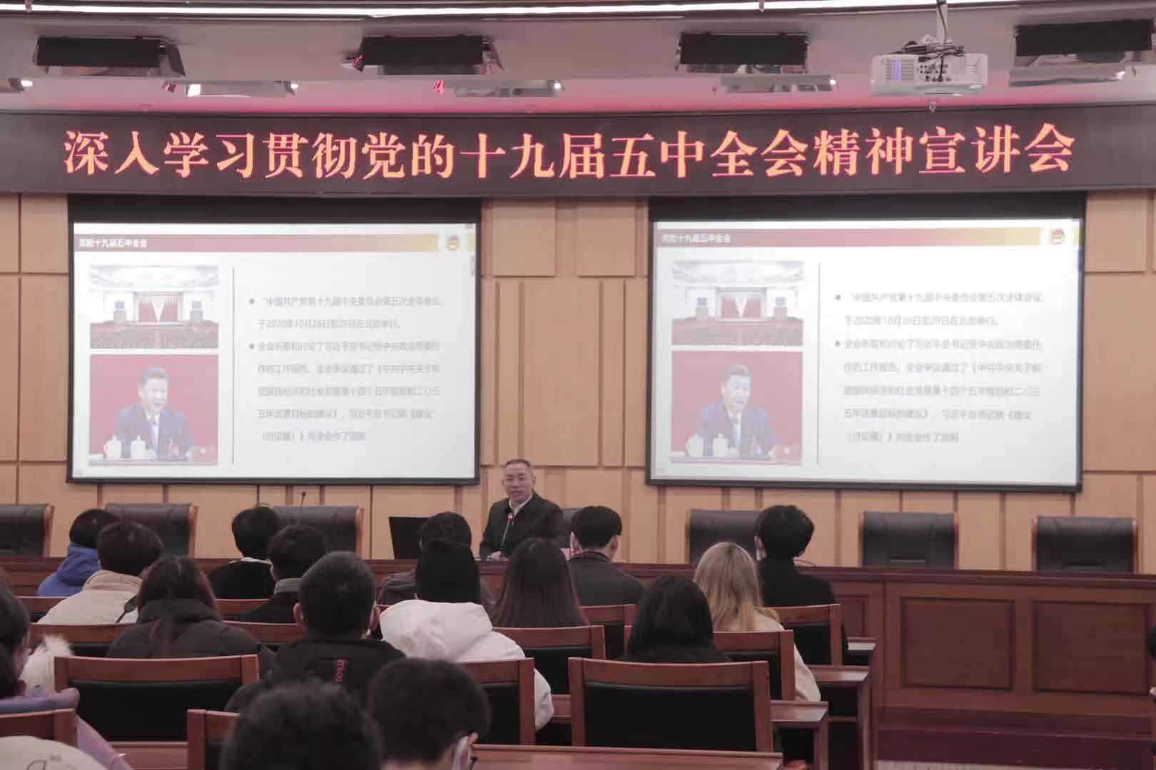 为深入贯彻党的十九届五中全会精神,指导大学生如何成长成才。12月29日下午,深入学习贯彻党的十九届五中全会精神宣讲会在我校南岸校区新图书馆第一会议室顺利召开。100余名学生骨干参加会议,本次会议由校团委副书记胡婧婷主持。