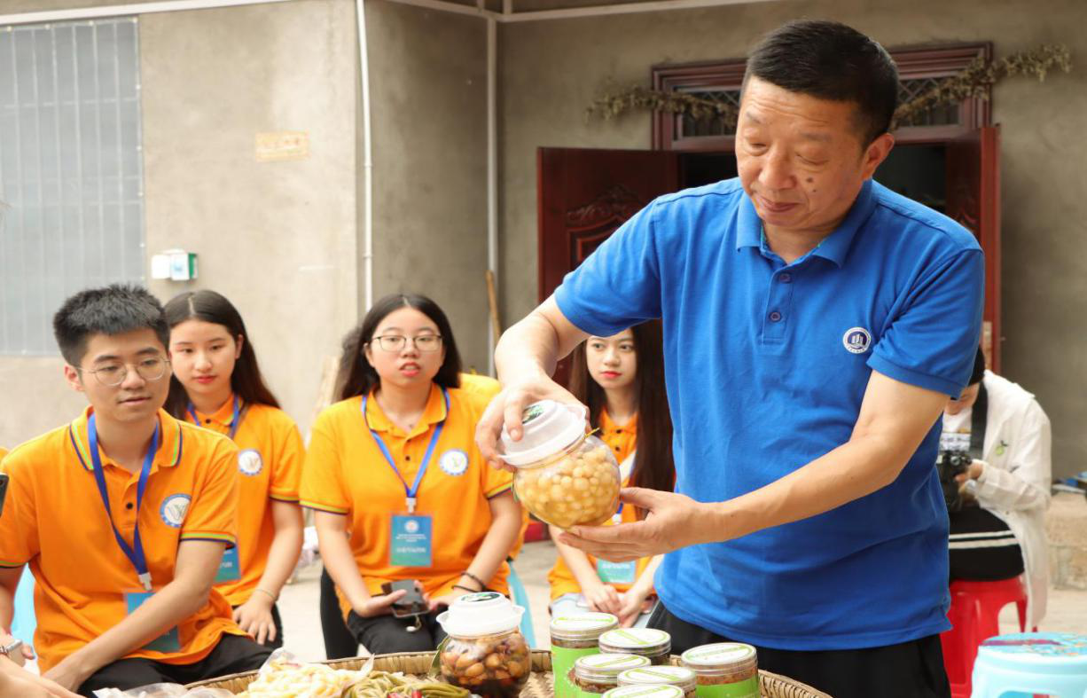 实践团首先来到忠县毛妈妈土特产经营部,参观泡菜、麦酱等农副产品的生产加工流程,并与生产经营者一起深入座谈。座谈中,实践团师生了解到“毛妈妈”土特产是由该镇果园村的一农户家庭在当地政府的扶持下自主生产经营的本土系列酱菜,该家庭一家五口齐上阵,公婆制作,儿子儿媳宣传推广。在镇政府的引导下,坚持“纯手工、无添加”的“原生态”生产理念,采用传统的日晒、自然发酵、柴火灶加工等制作工艺制作,深受广大消费者喜爱。与此同时,他们也面临同类产品竞争激烈、对外宣传推广能力不足的现实问题,实践团师生就微信短视频拍摄及产品外观设计等问题提出了相应建议。