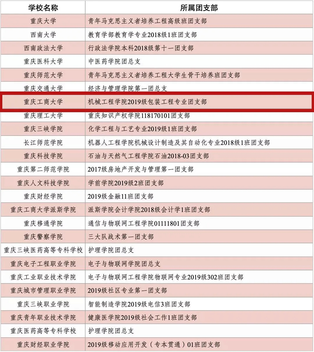 按照要求,每所高校仅能推报1个候选集体,活力团支部评选标准有:班子建设好、团员管理好、活动开展好、制度落实好、作用发挥好,全方位考察团支部建设。经高校择优推报、团市委和市学联初评、网络展示、全国终审等环节,我校机械工程学院2019级包装工程学院专业团支部成功晋级国家级活力团支部评选,并最终成为重庆25个全国高校“活力团支部”之一。