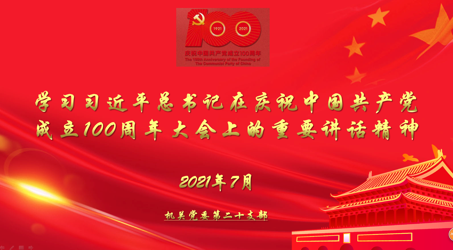 7月13日,按照上级通知要求,机关党委第二十支部在党员自学的基础上,在团委会议室专题学习了习近平总书记在庆祝中国共产党成立100周年大会上的重要讲话精神。支部书记杨娟组织学习。