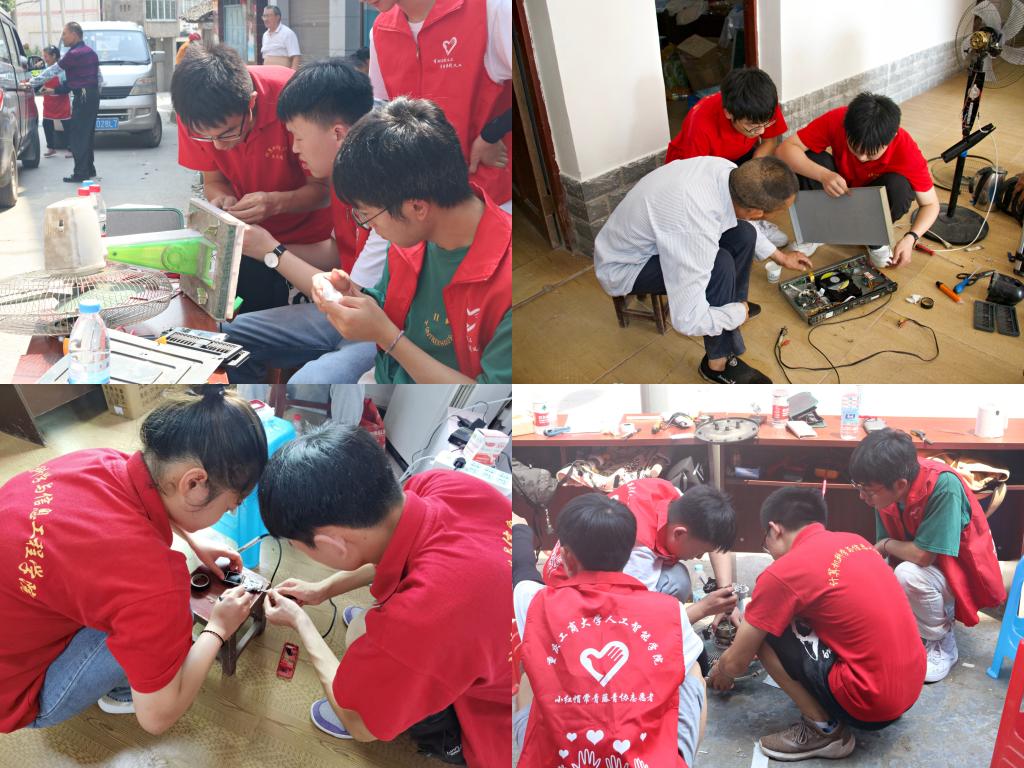 15日和18日,实践团利用当地赶集之日在社区门口搭建了临时义务维修点,吸引了不少村民驻足围观。从开始的看热闹不信任到最后送修的人络绎不绝,实践团成员用耐心的讲解和专业的技能赢得了村民的广泛认可。在进村入户的过程中,实践团顶着烈日挨家挨户询问是否需要帮助,简单的问题当场处理,疑难杂症的家电统一收好搬运至石梯村村委会集中维修。经过5天沉浸式维修,实践团修理好大部分家电,而剩下未修理好的电器大都因为年限太久、缺乏配件、维修成本过高等原因。