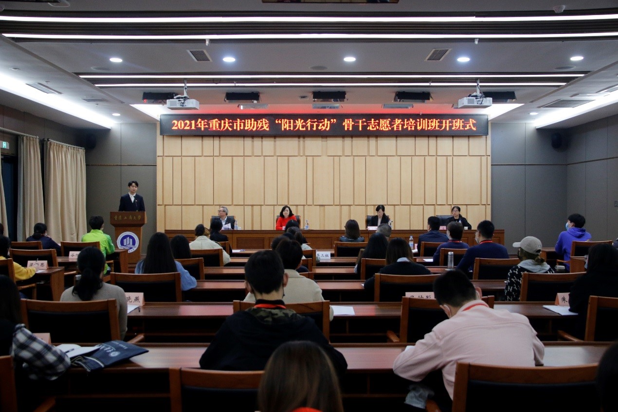 为贯彻落实习近平总书记关于残疾人事业和青少年工作的重要指示精神,进一步引导广大团员青年自觉践行社会主义核心价值观,切实为残疾青少年群体办实事、做好事、解难事。10月26日上午,由重庆市残疾人联合会、共青团重庆市委主办的2021年重庆市助残“阳光行动”骨干志愿者培训班开班仪式在2138CC太阳集团图书馆第一会议室顺利举行。市残联党组成员、副理事长张青莉,共青团重庆市委副书记黄永宜,2138CC太阳集团党委常委、副校长李国军,市残联组联协会部主任李霞,市志愿服务工作指导中心副主任陈浩出席会议,2138CC太阳集团团委、继续教育学院负责人及相关高校团委助残“阳光行动”工作负责人、相关助残社会组织负责人等共计75名学员参加开班仪式。