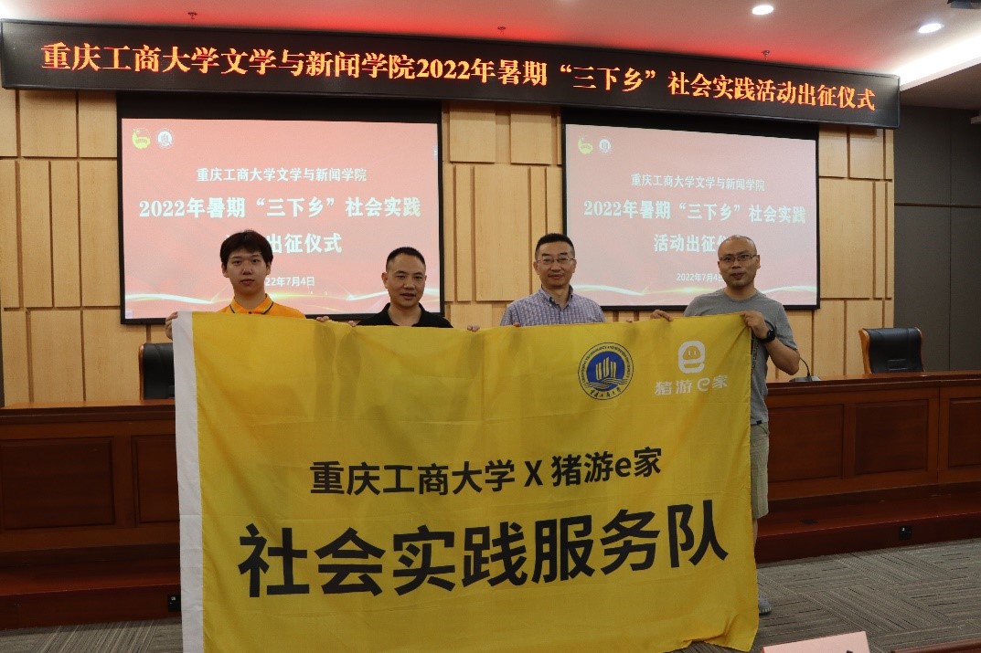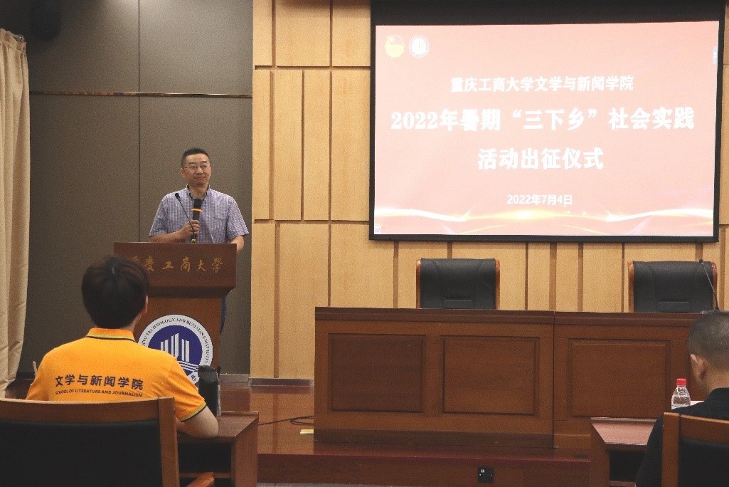 7月4日上午9点50分,我校文学与新闻学院2022年暑期“三下乡”社会实践活动出征仪式在图书馆第一会议室举行。文学与新闻学院分党委书记李华平、党委副书记程元元、学工办主任刘平、广告系主任王凌峰、广播电视学教师谈华伟、专职辅导员陈思燃以及重庆租游科技有限公司董事长万华出席本次出征仪式。