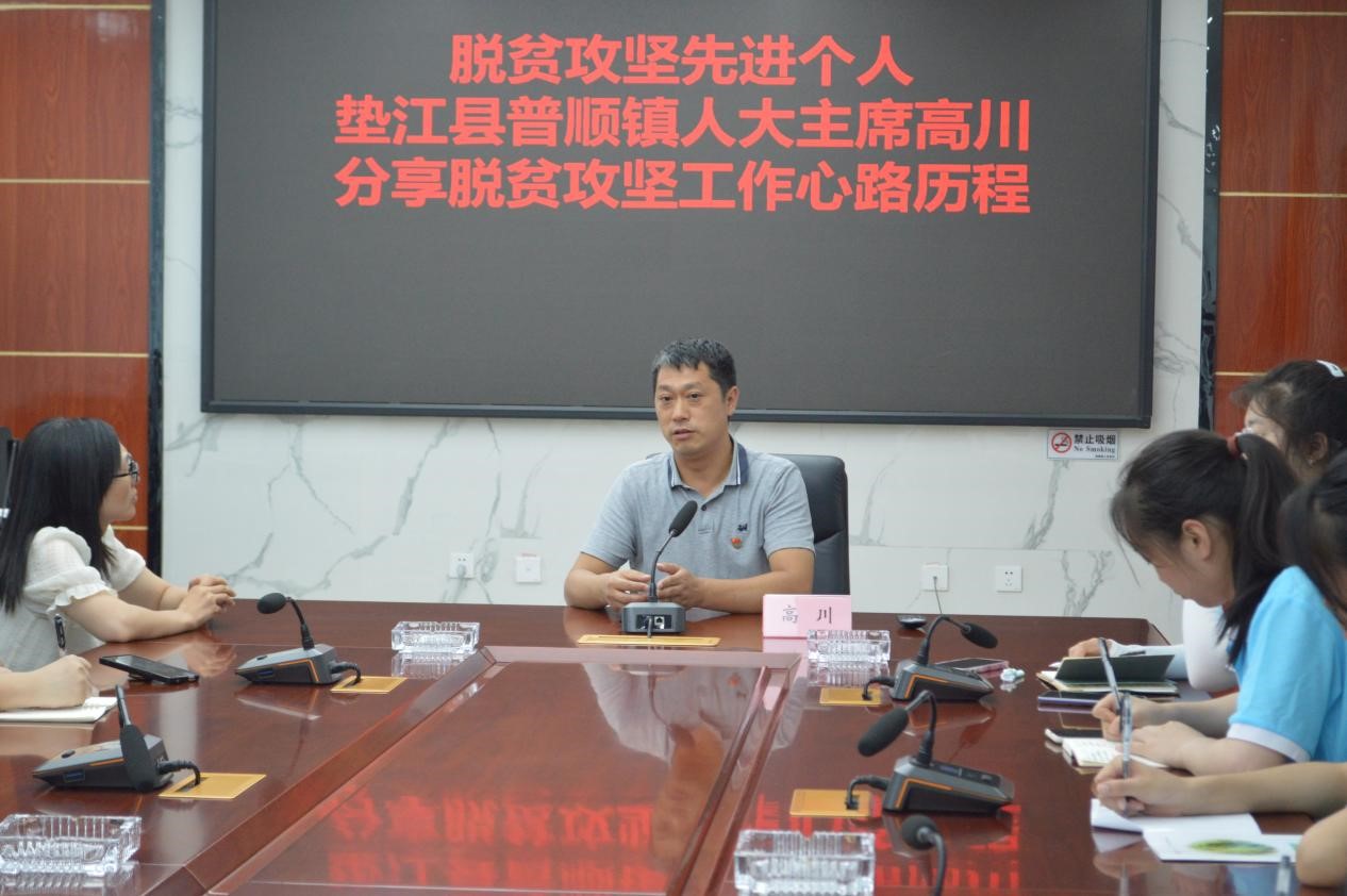 7月15日上午,实践团前往垫江县普顺镇政府访谈脱贫攻坚先进个人、普顺镇人大主席高川,了解他带领普顺镇红岩村脱贫致富的心路历程。在“三用”(“用心、用力、用情”)的理念指引下,他积极主动开展调查研究,整合各方资源,解决关键问题,为群众办实事。