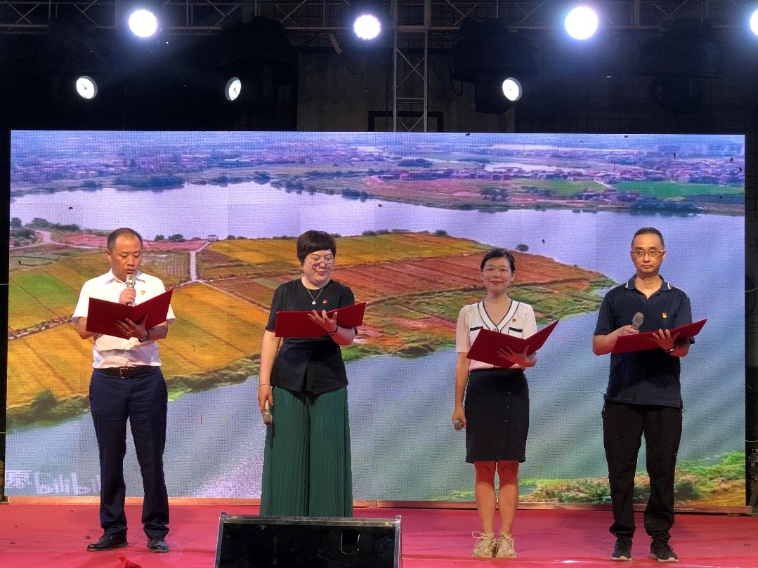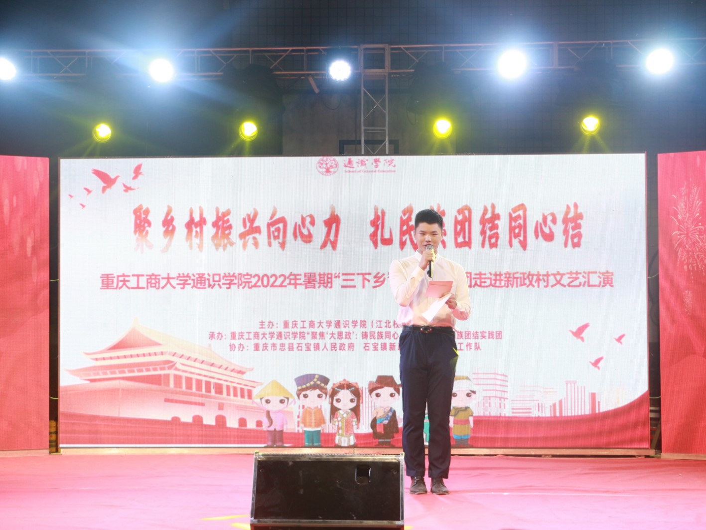 文艺下乡暖民心,乡村振兴正当时。7月16日晚,通识学院“聚焦‘大思政’:铸民族同心,促乡村振兴”民族团结实践团时隔一年后,再次走进重庆市忠县石宝镇新政村,举行“聚乡村振兴向心力,扎民族团结同心圆”主题文艺汇演。通识学院党总支副书记、副院长、江北校区管委会副主任况源,江北校区管委会副主任傅晓燕,通识学院党总支专职组织员宫彪,江北校区管委会副主任、新政村驻村第一书记兼工作队队长赵雄,忠县石宝镇党委书记胡素萍,石宝镇人大主席邓横峰,石宝镇党委副书记周政等石宝镇人民政府领导,新政村、两河村驻村工作队及村委,通识学院综合办、学工办、分团委负责人以及实践团全体成员与当地村民们欢聚一堂,别样的“村晚”大舞台彰显了文艺下乡的独特魅力。