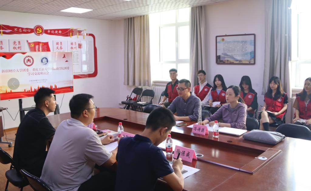 为深入学习贯彻习近平新时代中国特色社会主义思想和党的十九届六中全会精神,贯彻落实习近平总书记关于青年工作的重要思想,同时深入了解在党的领导下,西部少数民族地区的高校发展状况, 7月21日上午,国际商学院“踏梦茵茵边疆土,赓续绵绵民族情”暑期三下乡社会实践团走进新疆财经大学并与校团委、法学院、国际经贸学院等教师共同举办学习交流座谈会。新疆财经大学团委副书记张耶乾,法学院团委副书记徐保成,国际经贸学院团委负责人明佳睿,我校国际商学院学团办主任、分团委书记冯诗淇、专任教师陈茂生以及实践团全体成员出席本次会议。